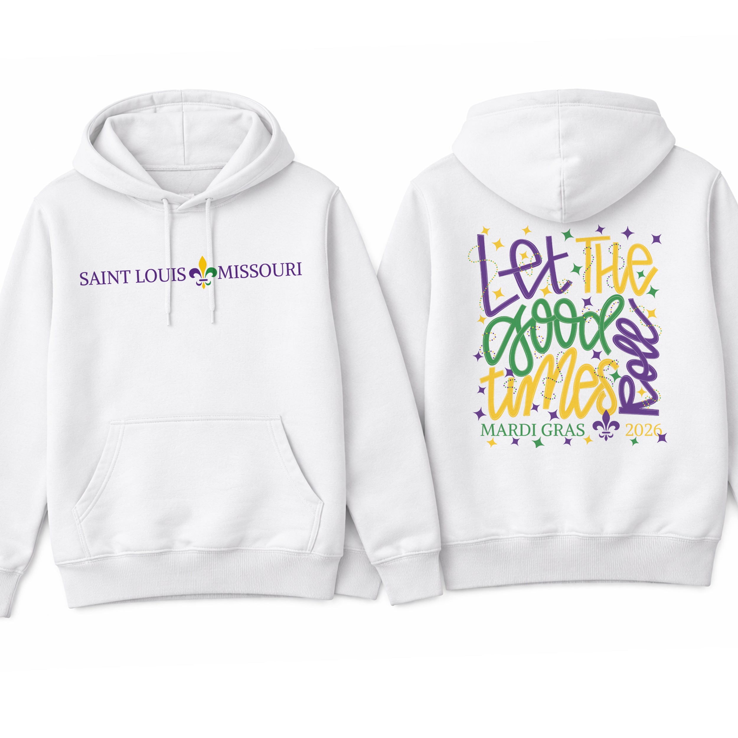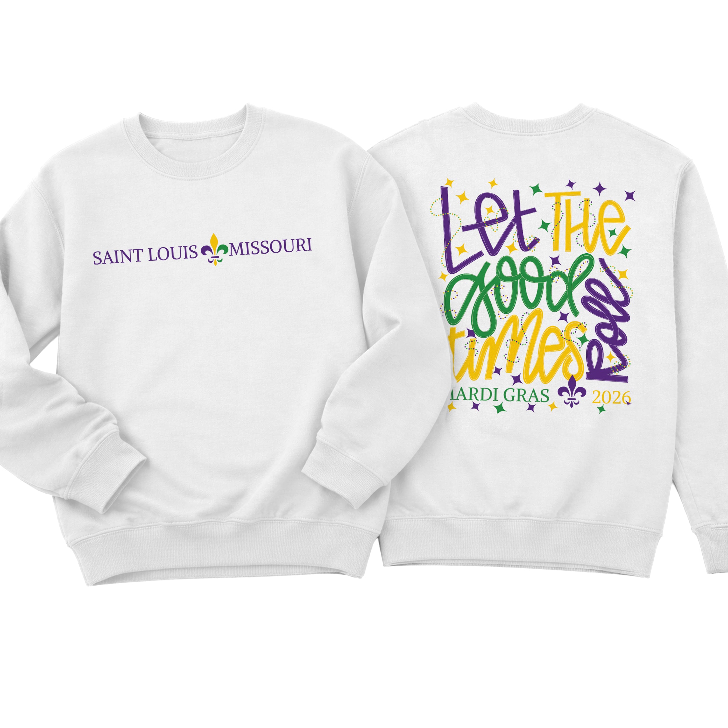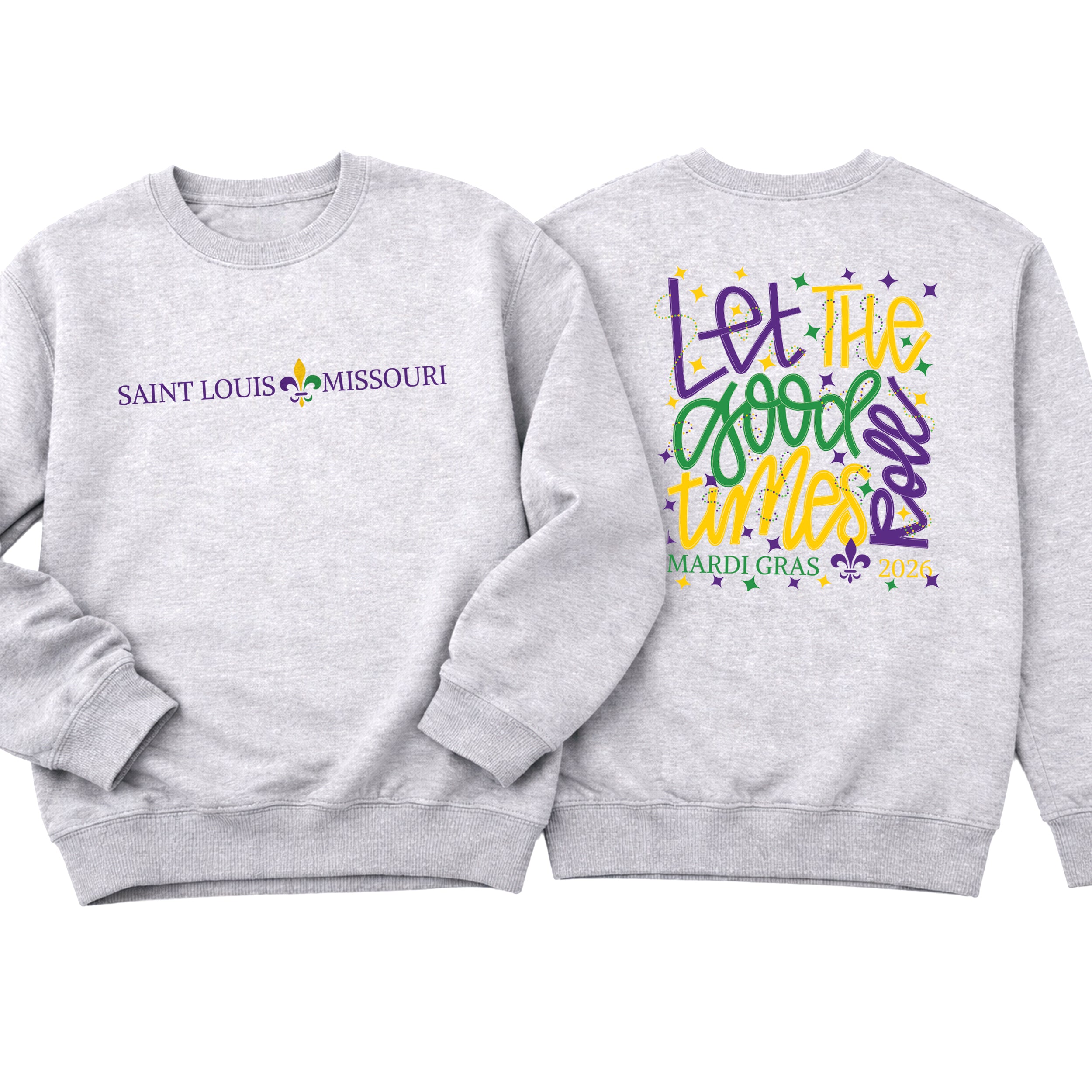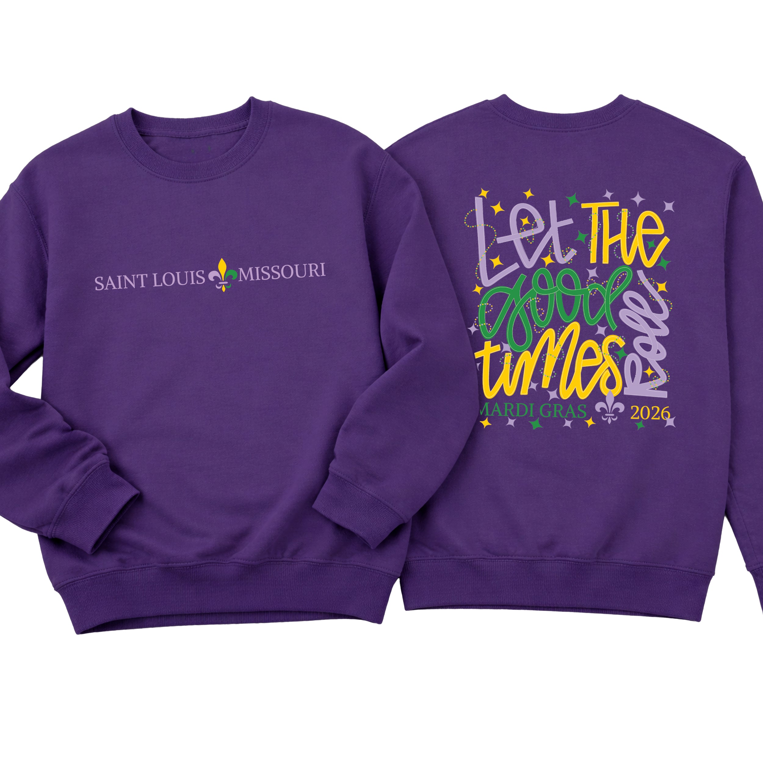 Celebrate in bold St. Louis style with this “Let the Good Times Roll” Mardi Gras 2026 Crewneck—a vibrant, double-sided design made for parades, patio parties, and all-day festivities in the heart of Soulard.
