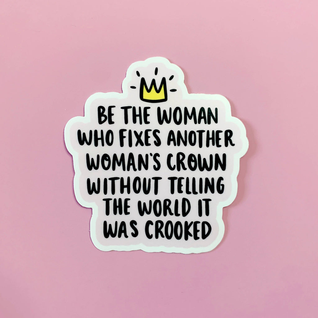 Get this girl-power, inspirational, and empowering sticker that reads "Be the woman who fixes another woman's crown without telling the world it was crooked."