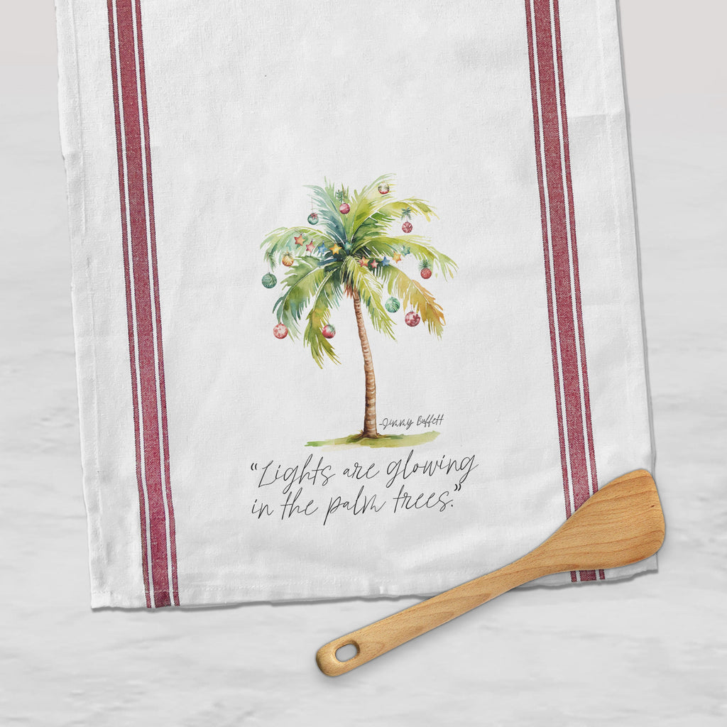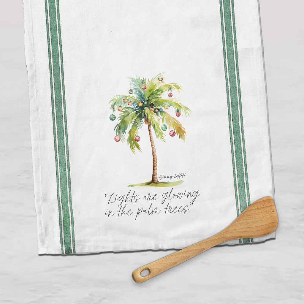 Get ready to infuse some coastal Christmas cheer into your kitchen with our hand-printed tea towel! Measuring a spacious 29 x 29 inches, this square-shaped towel combines the warmth of the holiday season with the relaxed vibes of the beach. Picture this: a festive watercolor palm tree adorned with twinkling lights under a starry night sky, paired with Jimmy Buffett's iconic quote, "Lights are glowing in the palm trees."