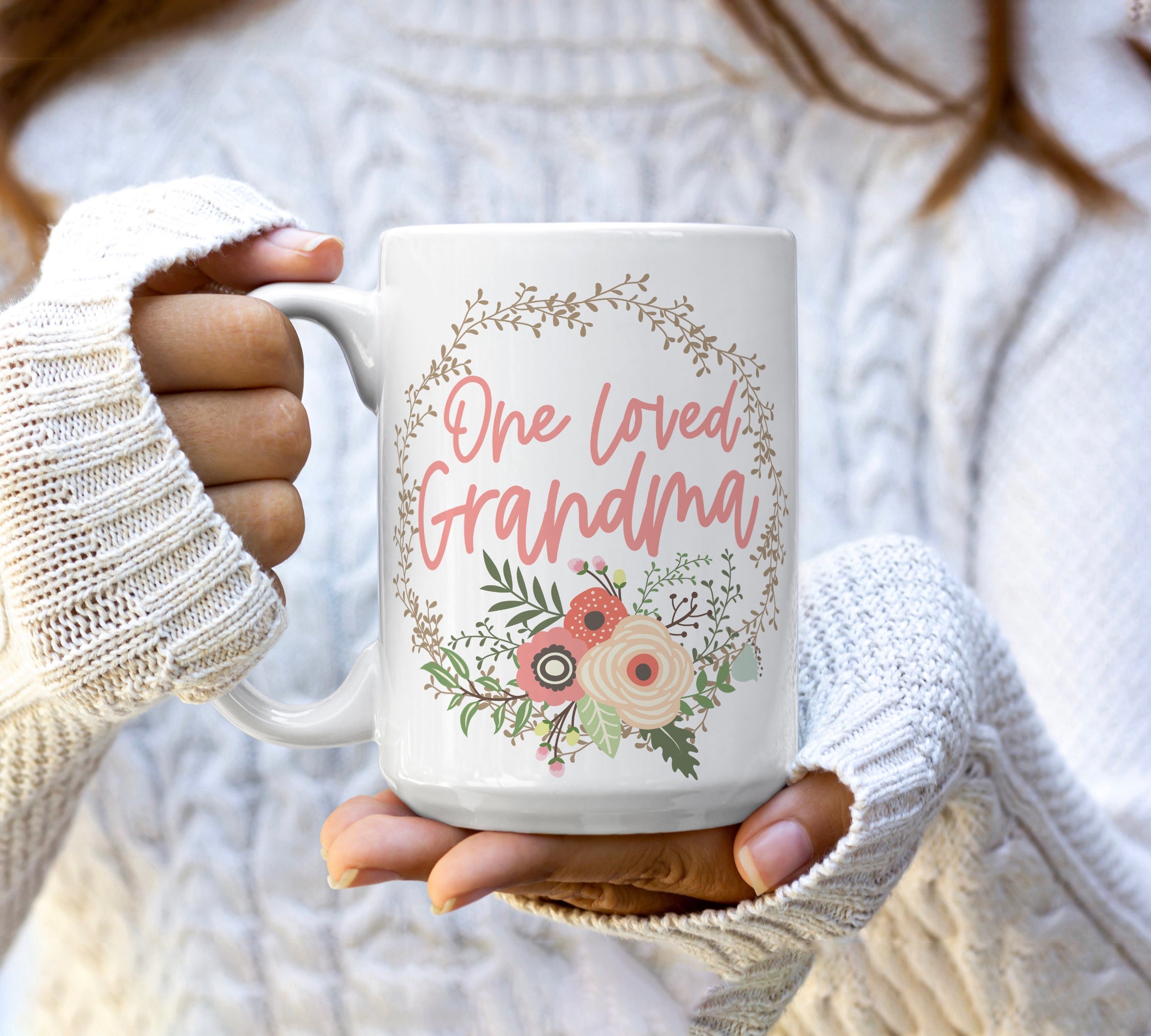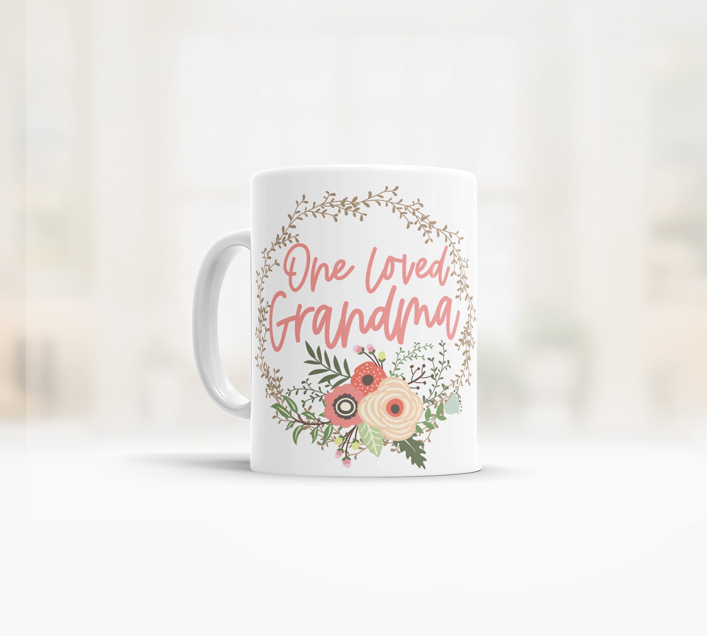 This sweet "One Loved Grandma" coffee or tea mug with pretty floral wreath design will make a great gift for your favorite grandma's birthday, Christmas, or Mother's Day!