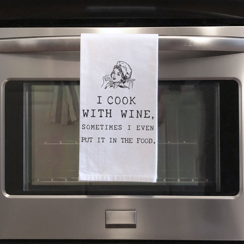 Cotton Tea towel | I cook with wine sometimes put it in the food | funny wine lovers dish towel |