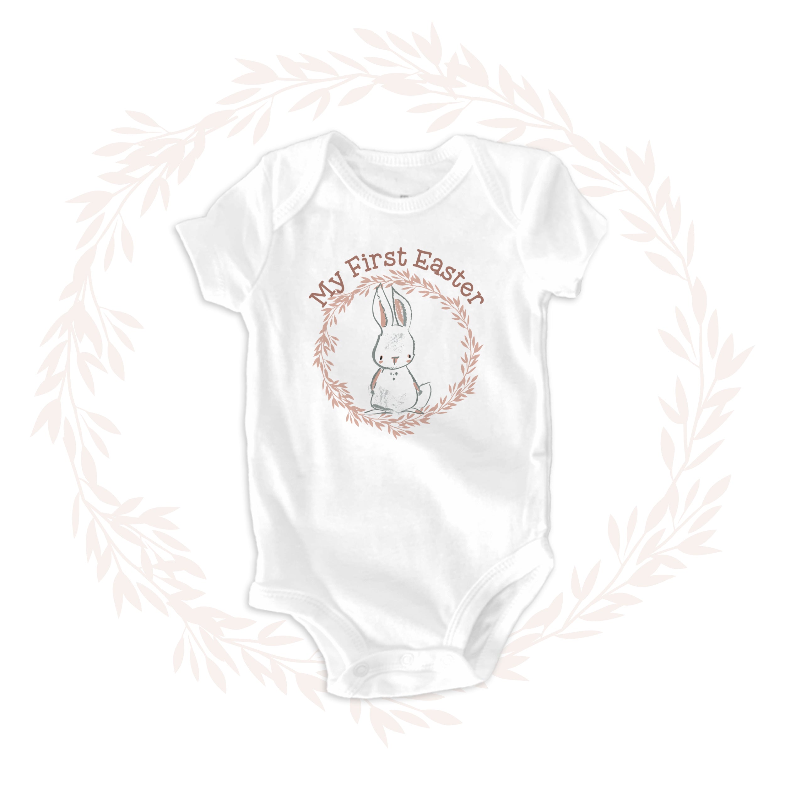 Is your little girl getting ready to celebrate her first Easter? Then this oh so sweet "My First Easter" bunny with a soft pink leafy wreath bodysuit is for you!