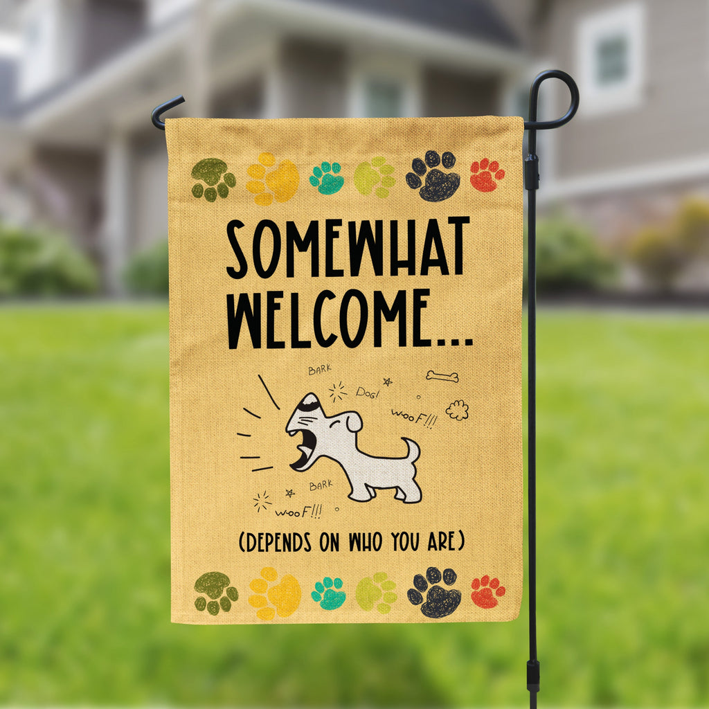 Somewhat welcome garden flag | funny dog barking house flag | depends on who you are garden flag