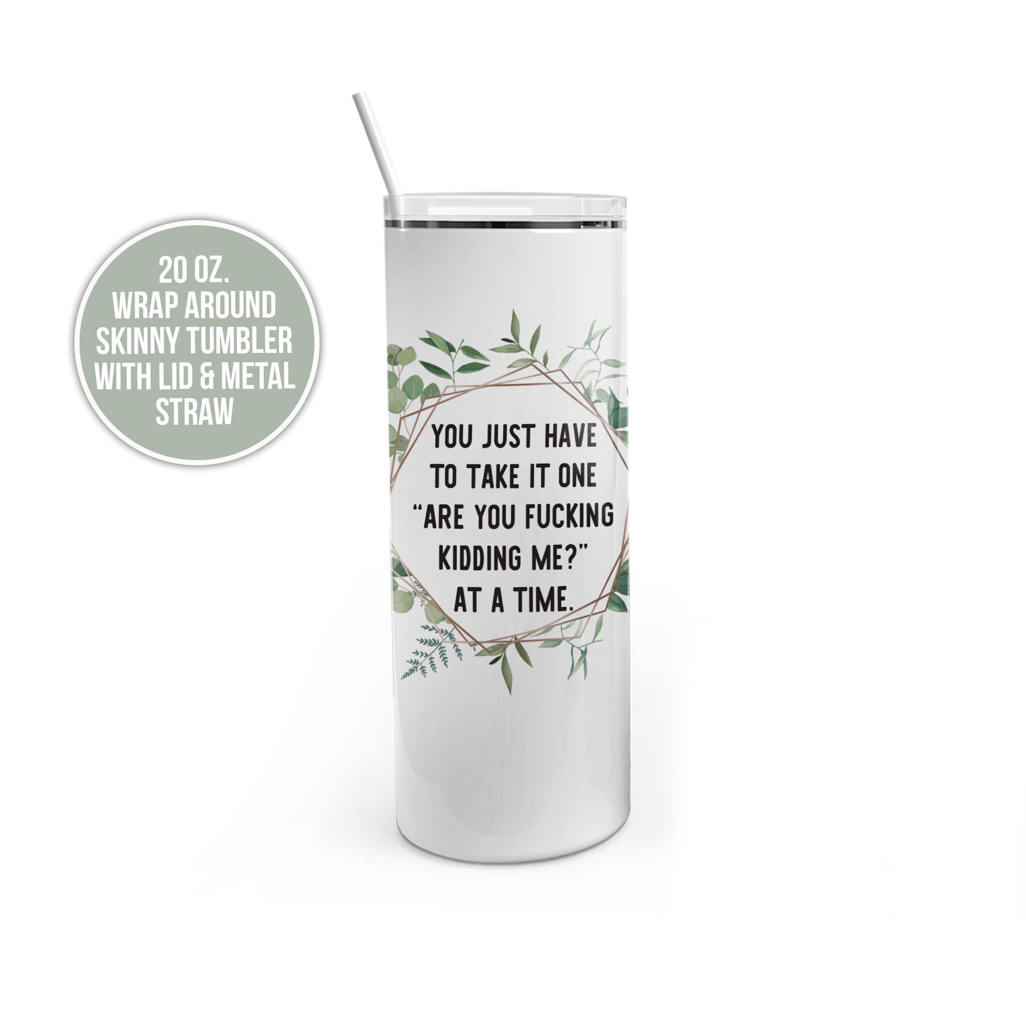 This funny snarky "you just have to take it "are you fucking kidding me" at a time" 20oz double wall 18/8 stainless steel thermal skinny tumbler with lid and straw is the perfect gift! The tumbler has vacuum insulation that keeps drinks cold for approximately 24 hours, and hot for about 12 hours. Conveniently fits into any standard size cup holders in vehicles. This skinny tumbler is non-toxic and BPA free.