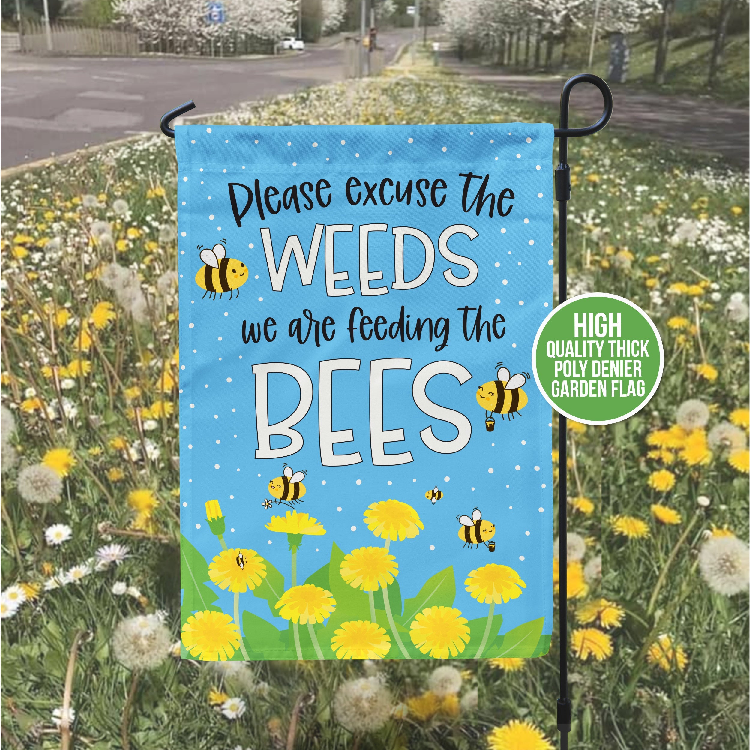 Save the bees! Let's do our part to help bee populations grow with this "Please excuse the weeds we are feeding the bees" garden flag! The flag is super high quality, not the shiny, cheap thin material - this will stand up to the elements!