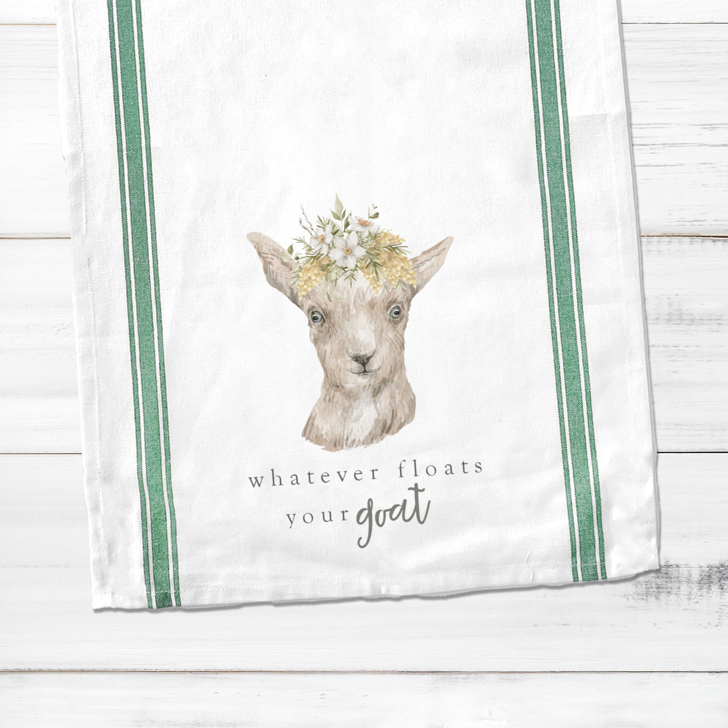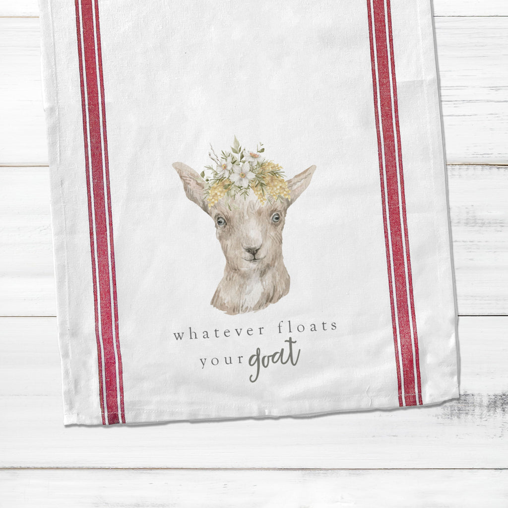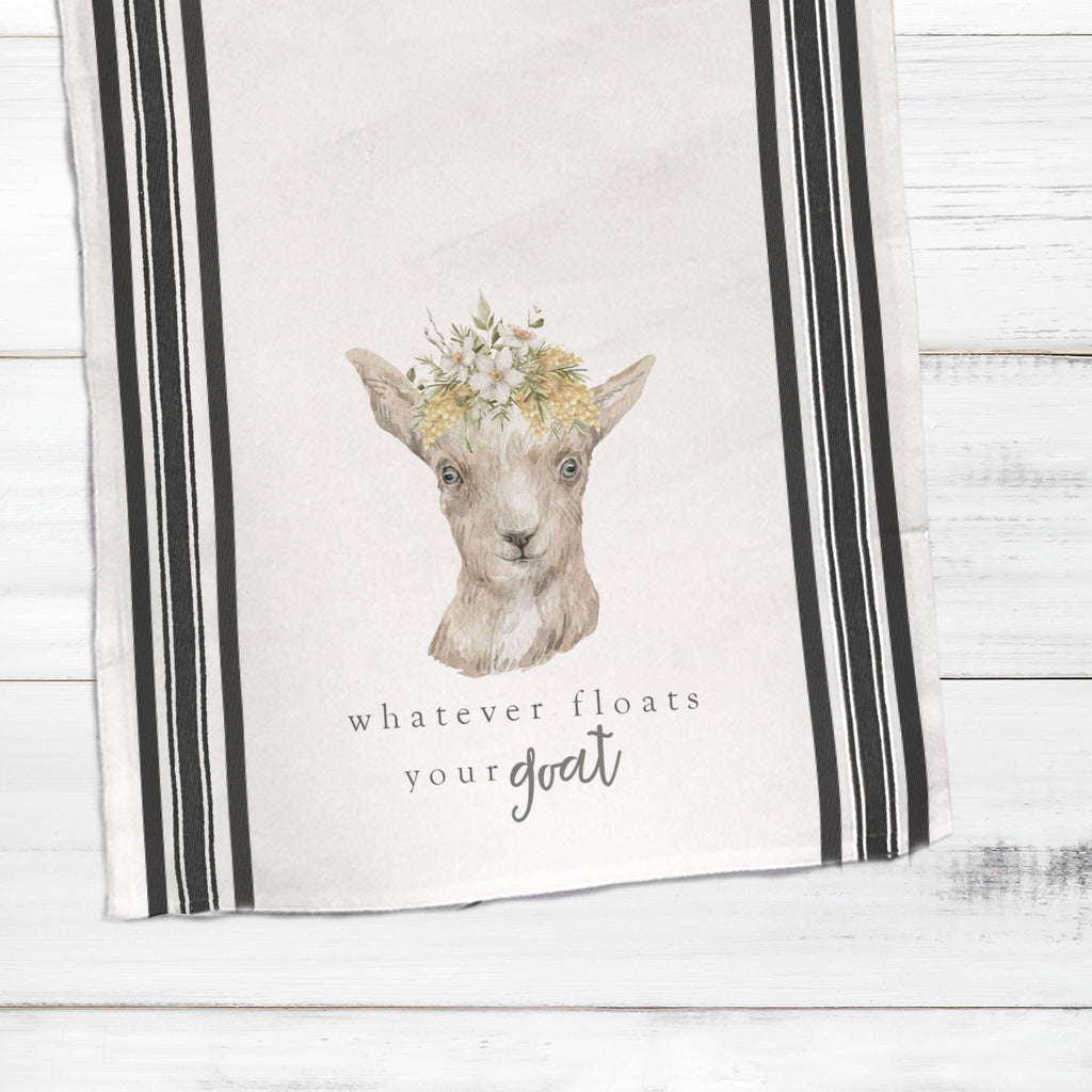 Tea towels are all the rage! This striped spring "whatever floats your goat" cotton tea towel with a goat makes a funny hostess / party gift and fun to display all year round!
