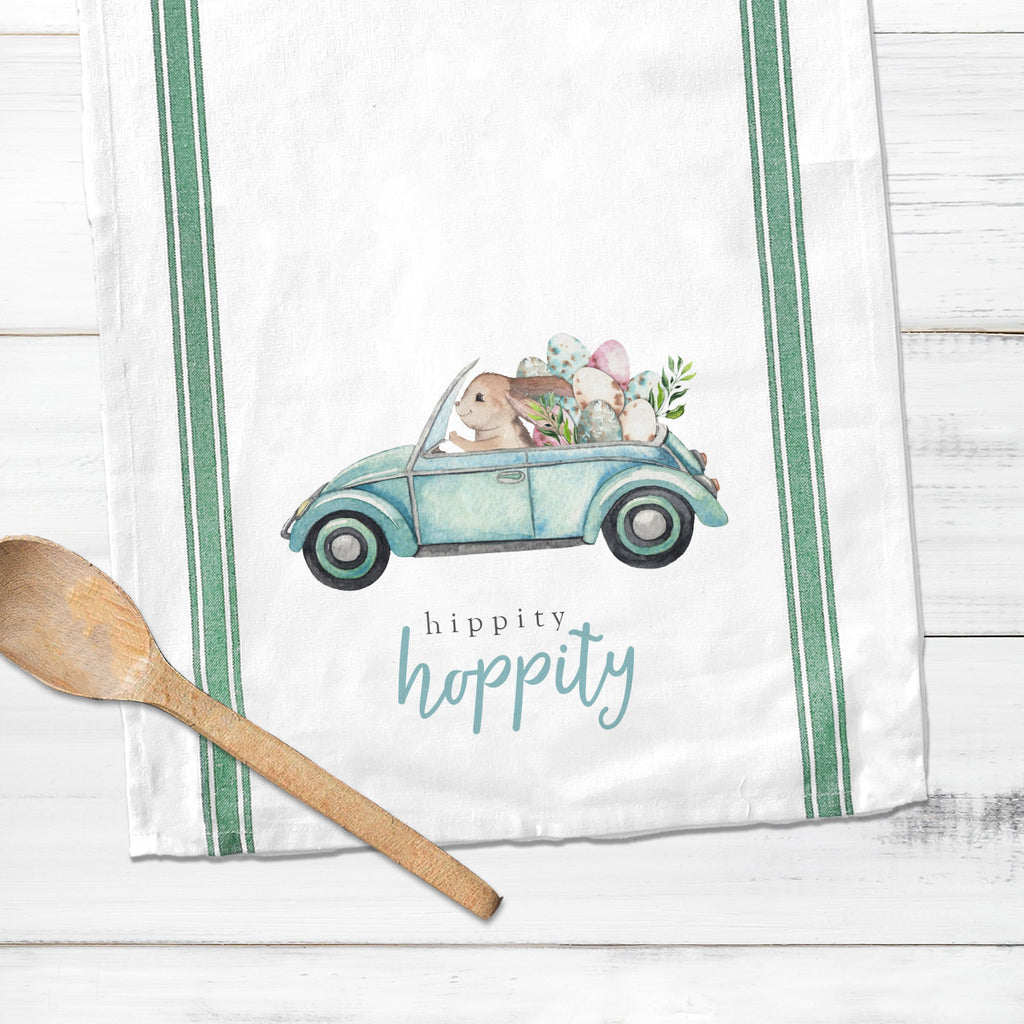Tea towels are all the rage! This "hippity hoppity" cotton tea towel with Easter Bunny design is so sweet! Adorable towel to display during the Spring Easter season! This digitally printed tea towel means that the fibers of the towel are actually dyed with eco-friendly water-based inks and is printed on a superior quality towel for long-lasting durability.