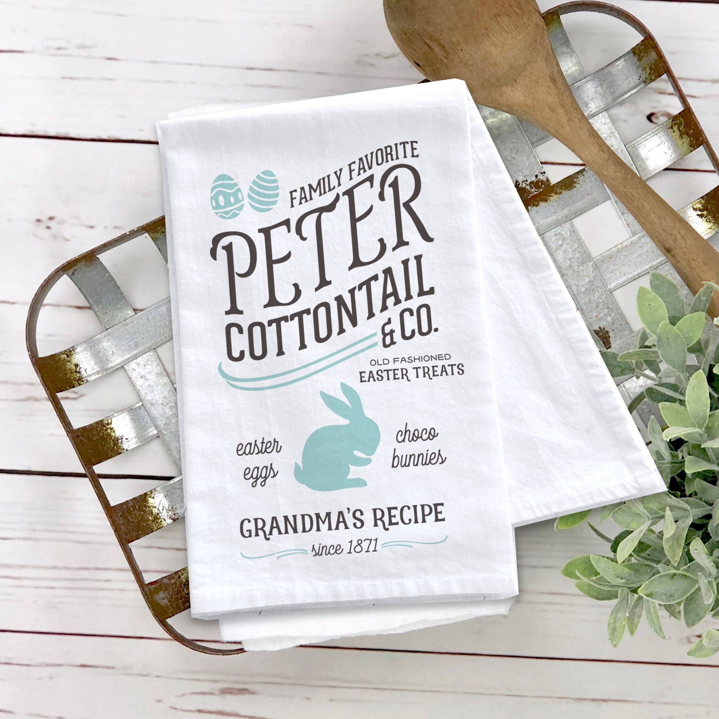 Easter cotton tea towel | peter cottontail & co. kitchen dish towel | easter egg treats choco bunnies decorative spring tea towel