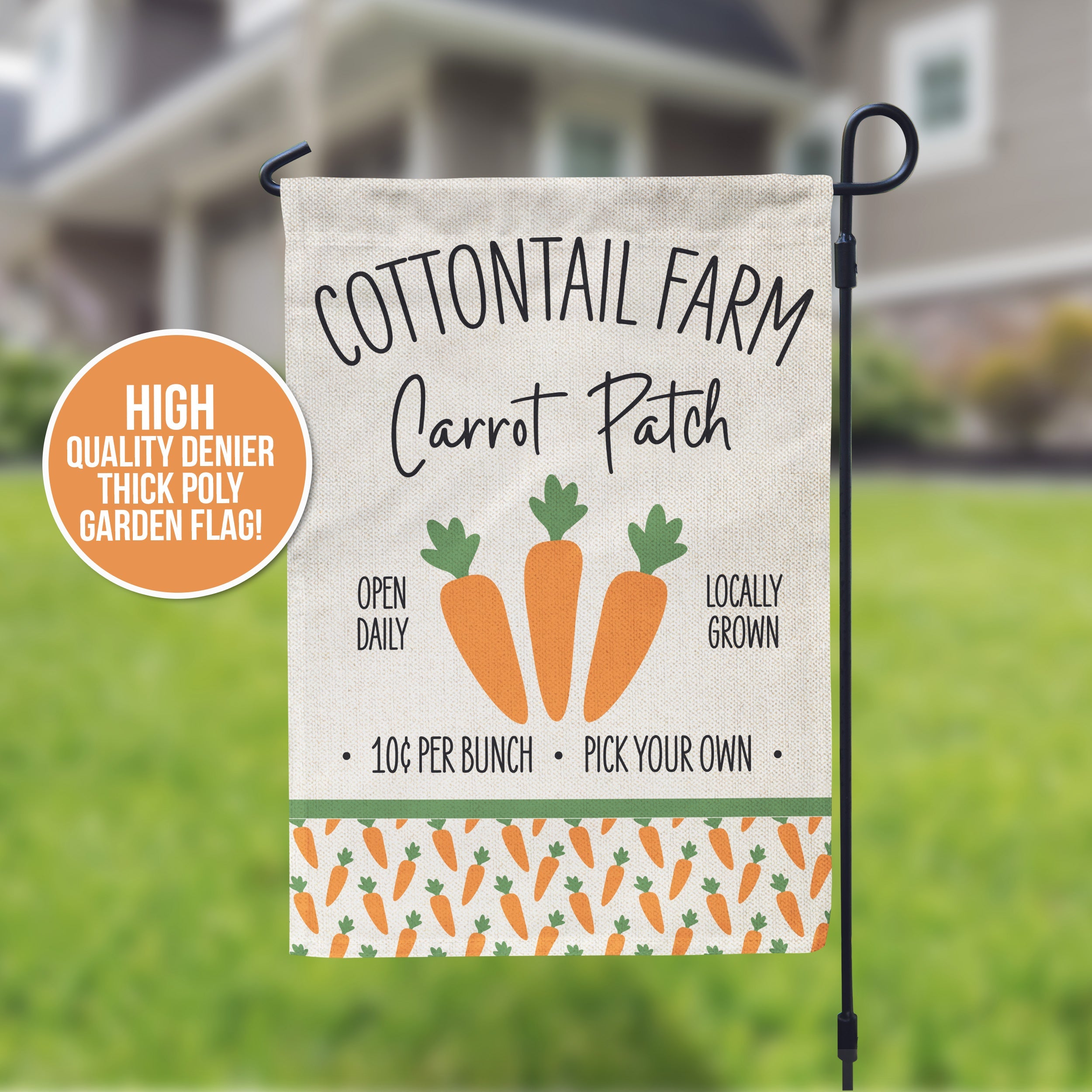 This adorable "Cottontail Farm Carrot Patch" garden house flag with faux linen or white background is super high quality, not the shiny, cheap thin material - this will stand up to the elements!