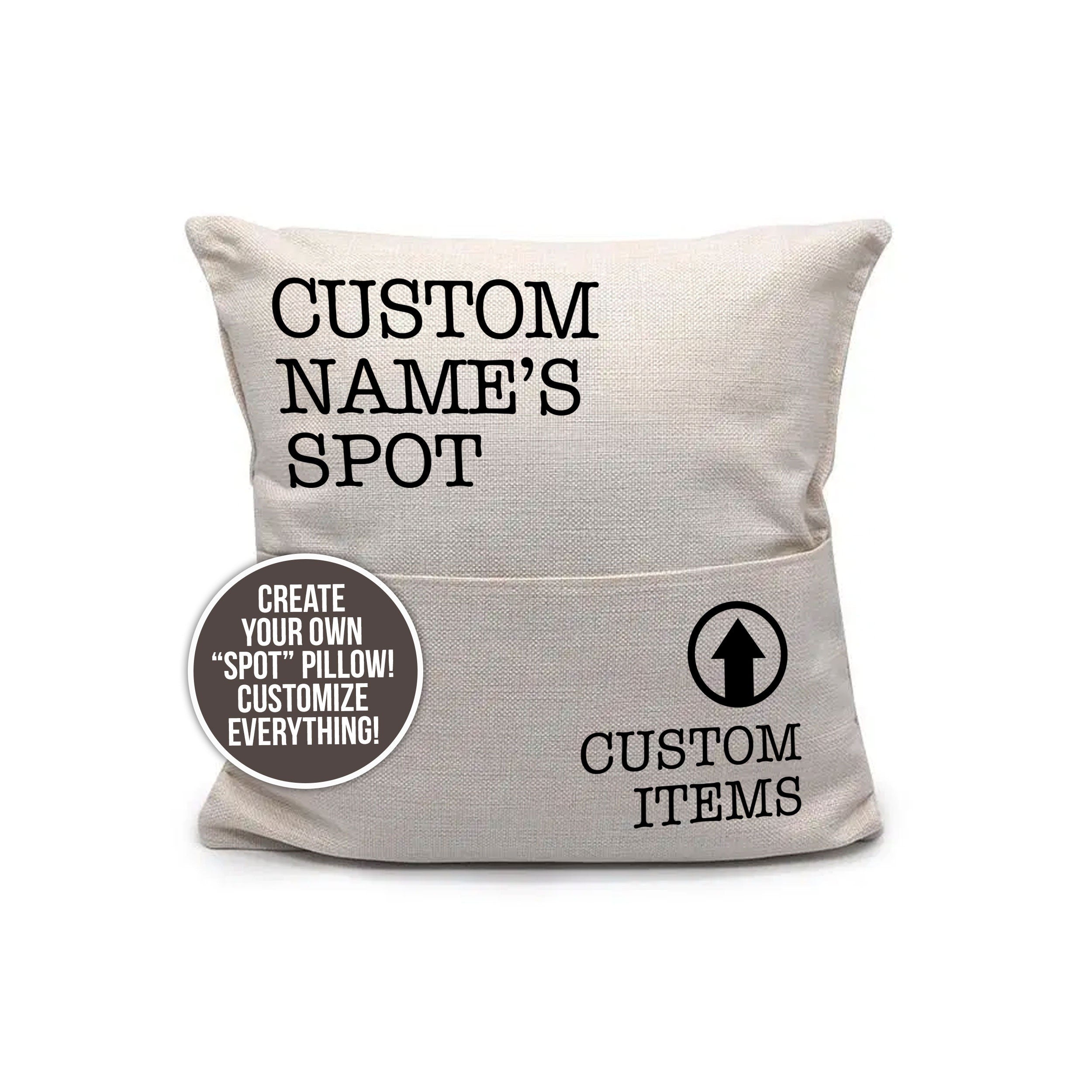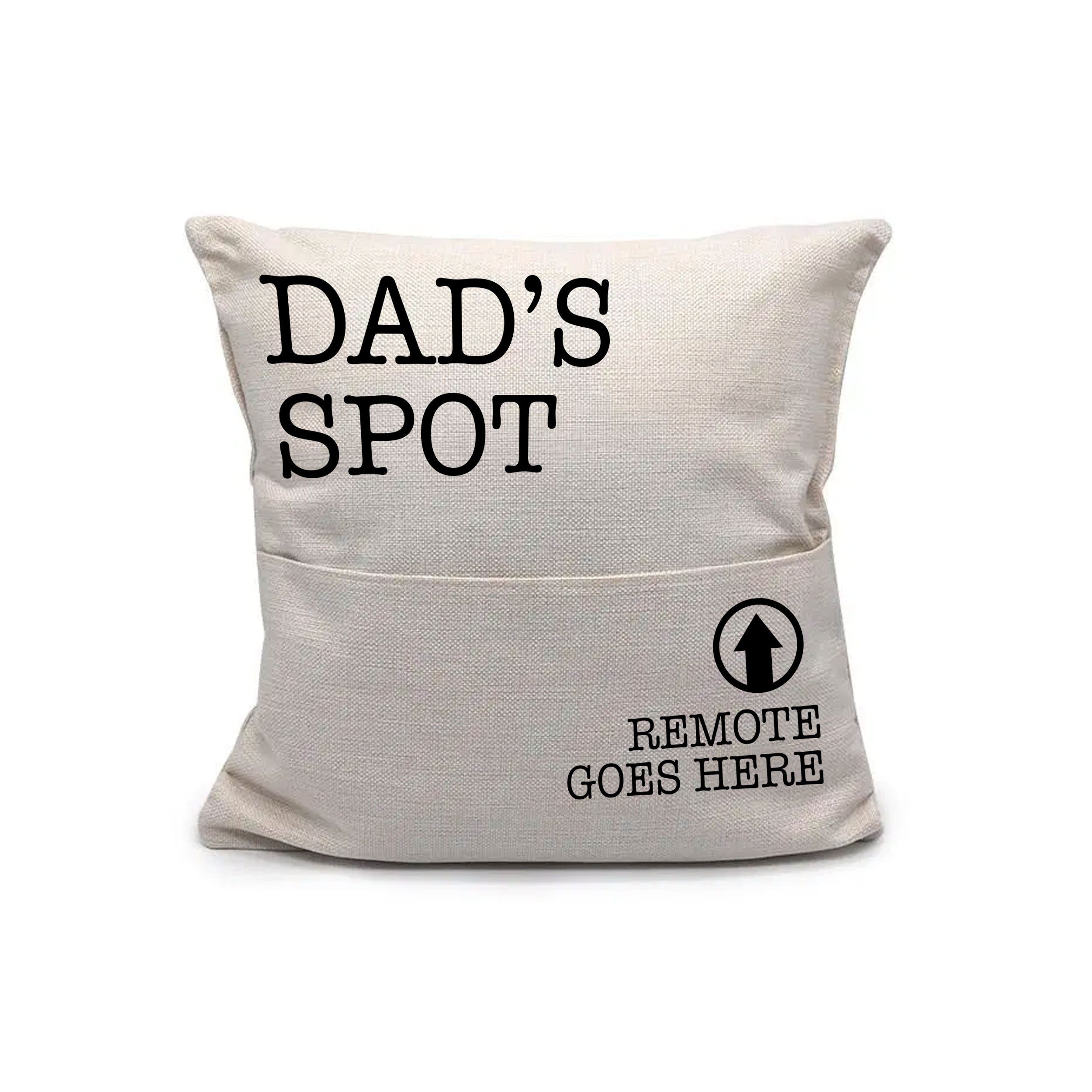 This approximately 16" x 16" (technically 40cm x 40cm) "Dad's Spot Remote Goes Here" faux linen pocket throw pillow cover with optional insert makes a great gift for Father's Day, birthday, or Christmas too! The pillowcase is a faux linen that looks and feels great and can be washed with normal cycle.