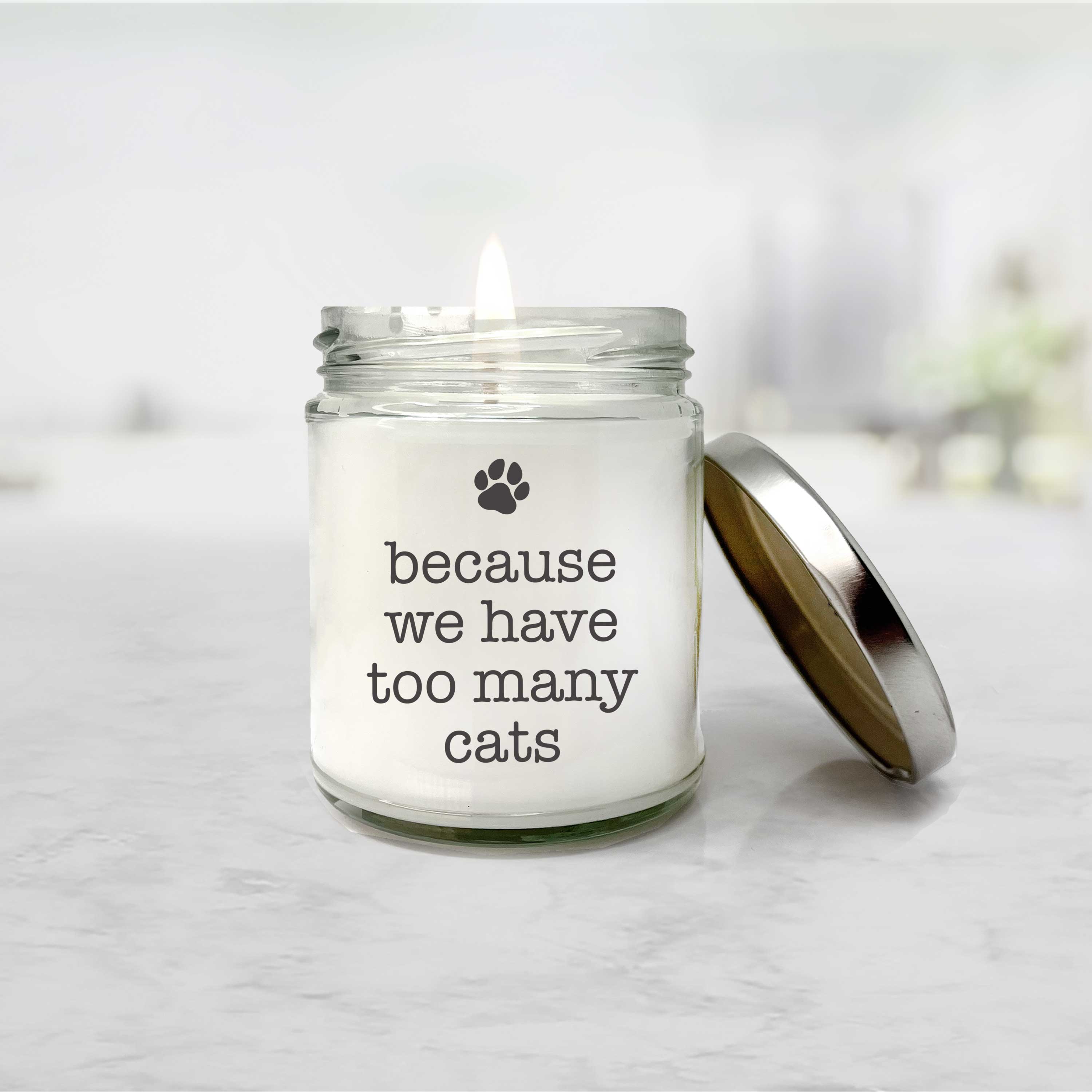 Are you or someone you know a cat lover? If so, this funny "because we have too many cats" soy wax candle is for you! Makes a great gift and a customer favorite too!