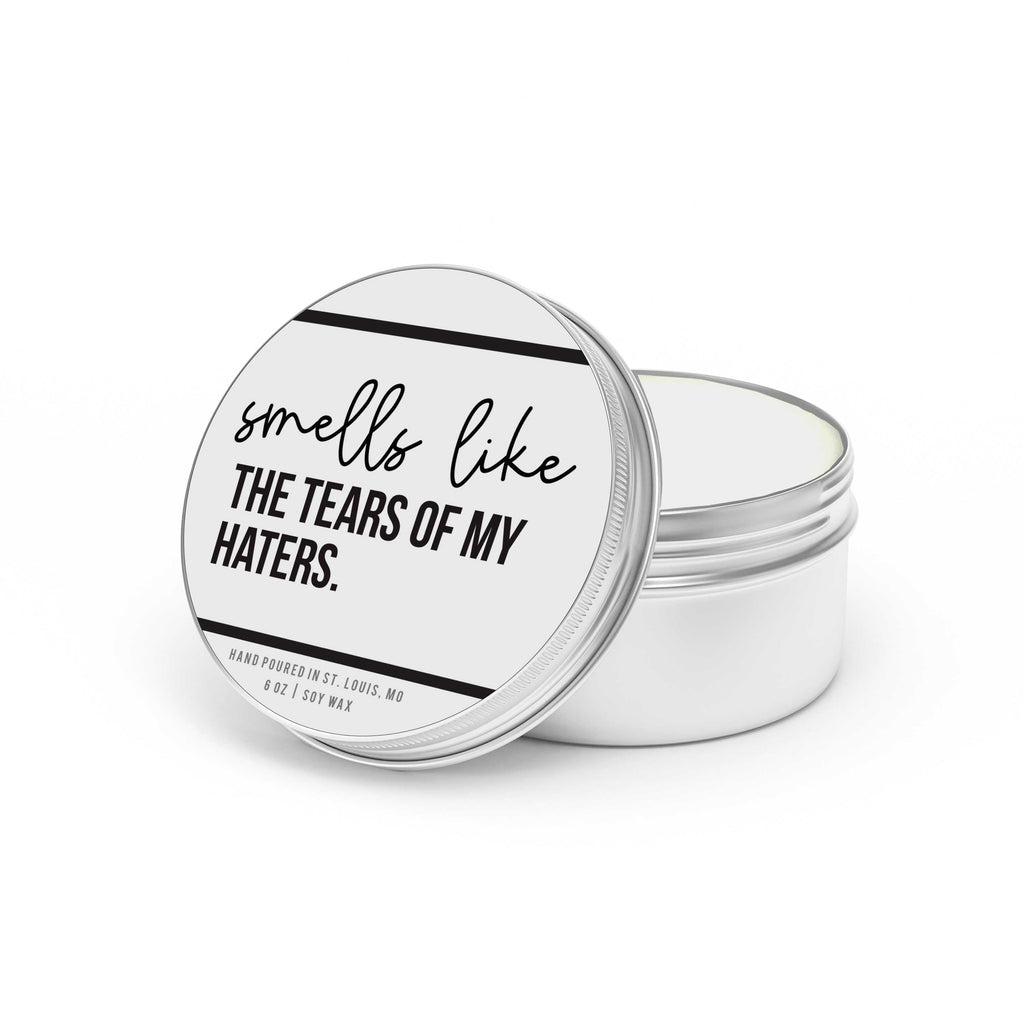 When you need to relax and escape life's stresses this super funny and totally sassy "smells like the tears of my haters" soy wax candle is just what you need! Available in a variety of sizes in a jar or tin. Makes a great gift for family, friends, co-workers, and a customer favorite too!