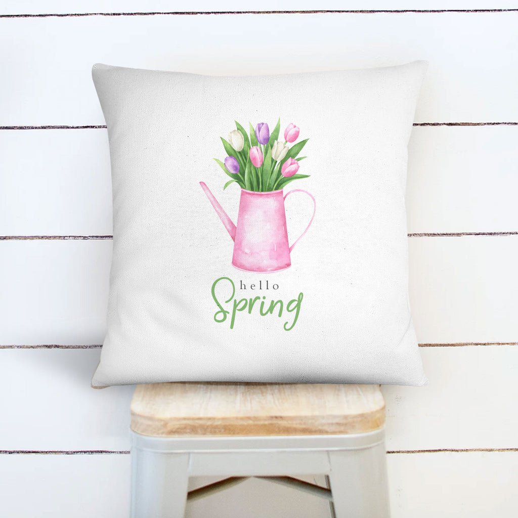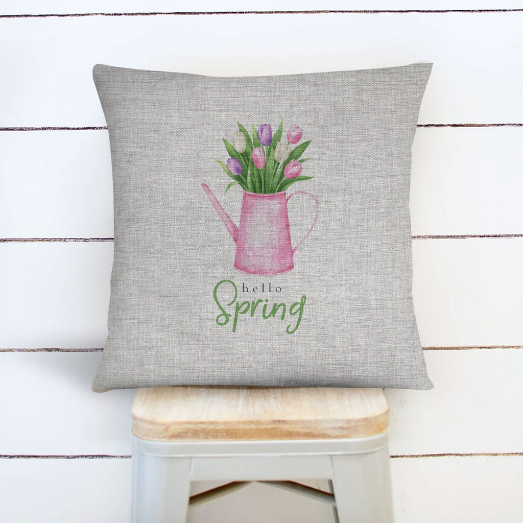 This "hello Spring!" throw pillow cover featuring tulips in a watercolor watering can design will make a great addition to your Spring home decor! Perfect for displaying in a cozy den, family room, or sun porch!