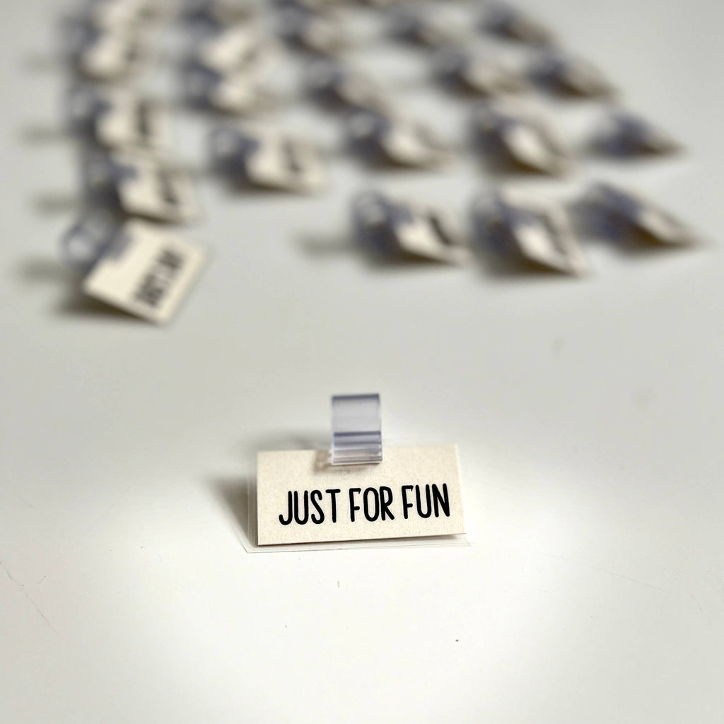 25 laminated printed greeting card category signs with plastic clips. Easily attached to acrylic shelves or acrylic pockets on spinning display.