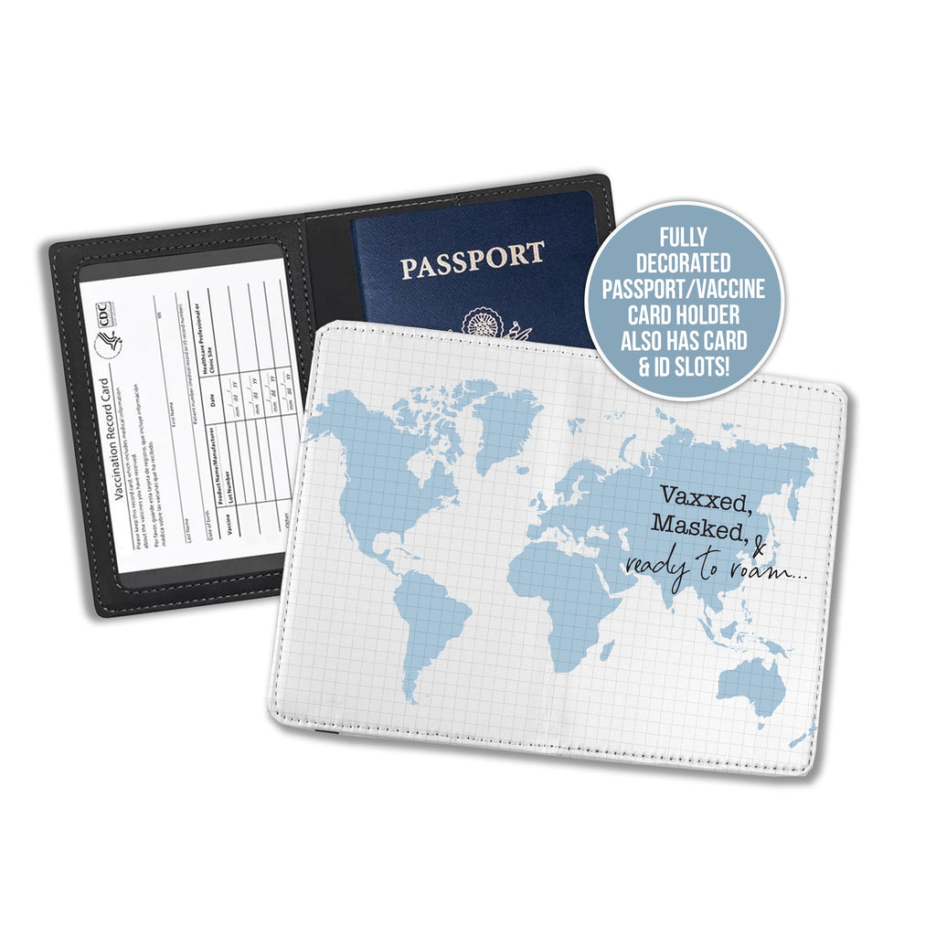 Have you been vaccinated for Covid-19 and also planning a trip? Then you'll need this handy "Vaxxed, Masked, & ready to roam" vaccine and passport travel documents holder. This vaccine / passport holder has an elastic strap for added protection of your important documents as well as a vaccine (or id or papers) holder on one side and your passport on the other. Hidden pockets as well for IDs, credit cards, and hotel keys, etc. It measures about 7.5" x 5.5" with front and back print decoration.