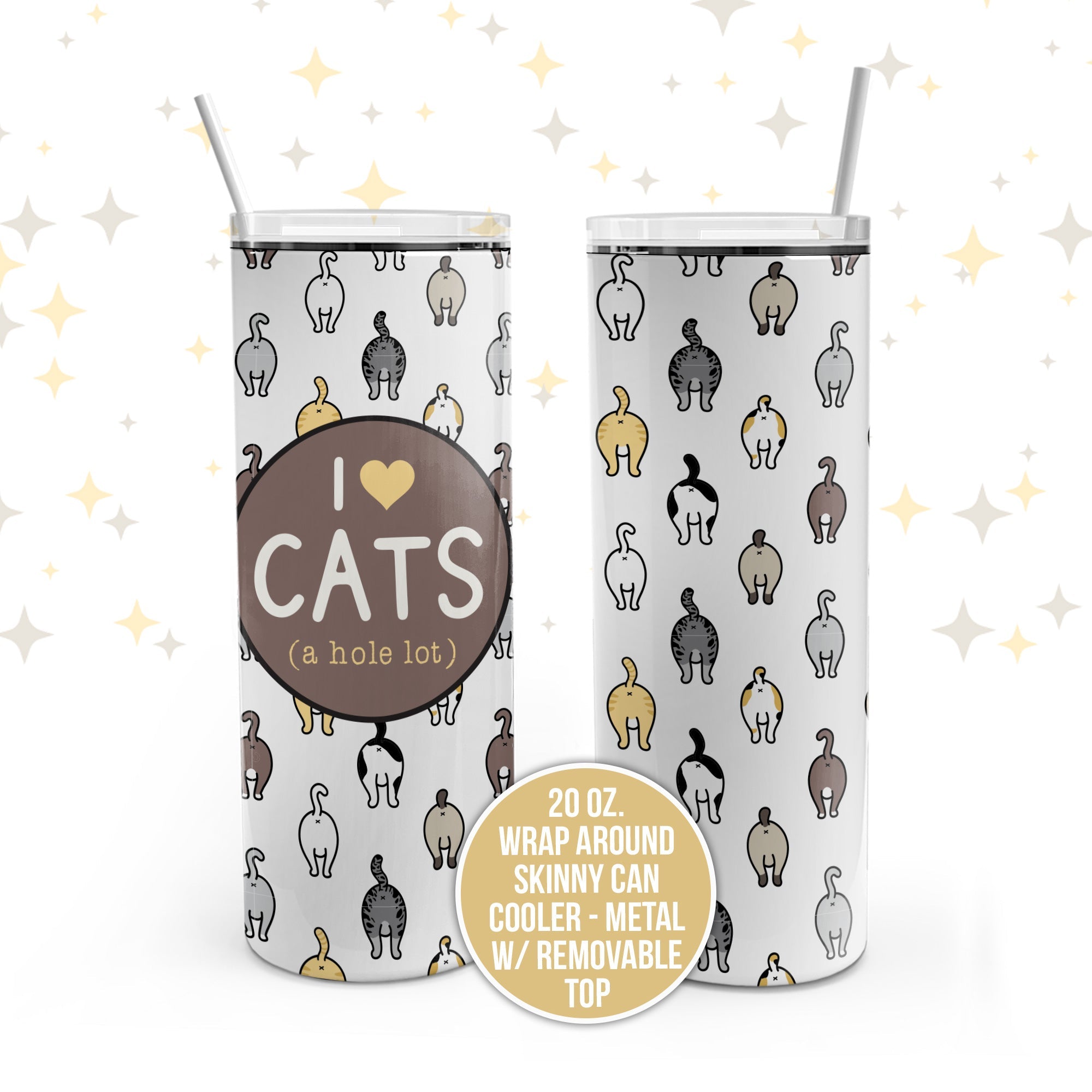 This funny "I heart cats (a hole lot)" 20oz double wall 18/8 stainless steel thermal skinny tumbler with wrap around design and lid and straw is the perfect gift for any cat lover! The tumbler has vacuum insulation that keeps drinks cold for approximately 24 hours, and hot for about 12 hours. Conveniently fits into any standard size cup holders in vehicles. This skinny tumbler is non-toxic and BPA free.
