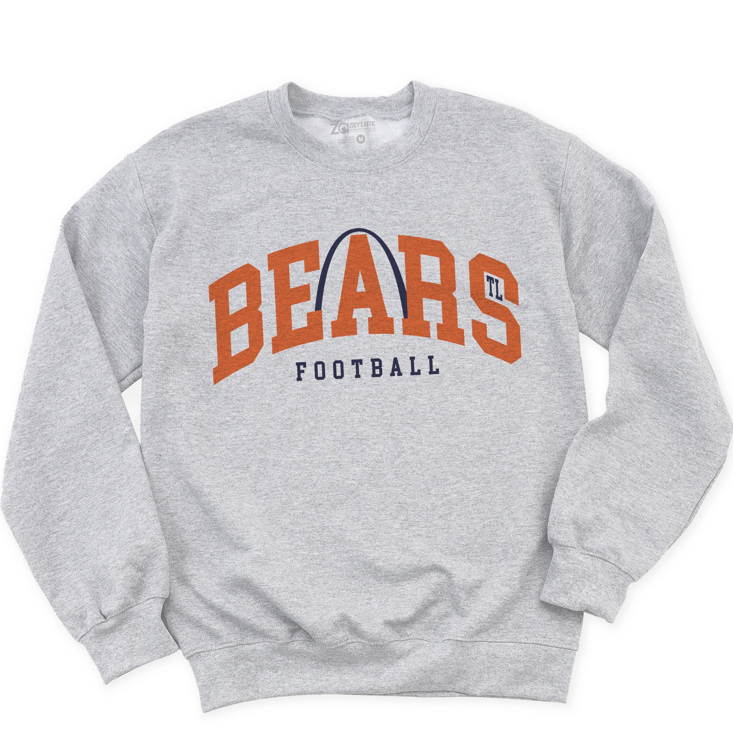 This cozy crewneck sweatshirt features a vintage-inspired BEARS FOOTBALL design with the iconic Gateway Arch worked right into the lettering—because in STL, we make every team our hometown team. Printed on a soft, athletic heather gray fleece, it’s the perfect layer for game days, watch parties, tailgates, or just stirring up a little friendly rivalry.